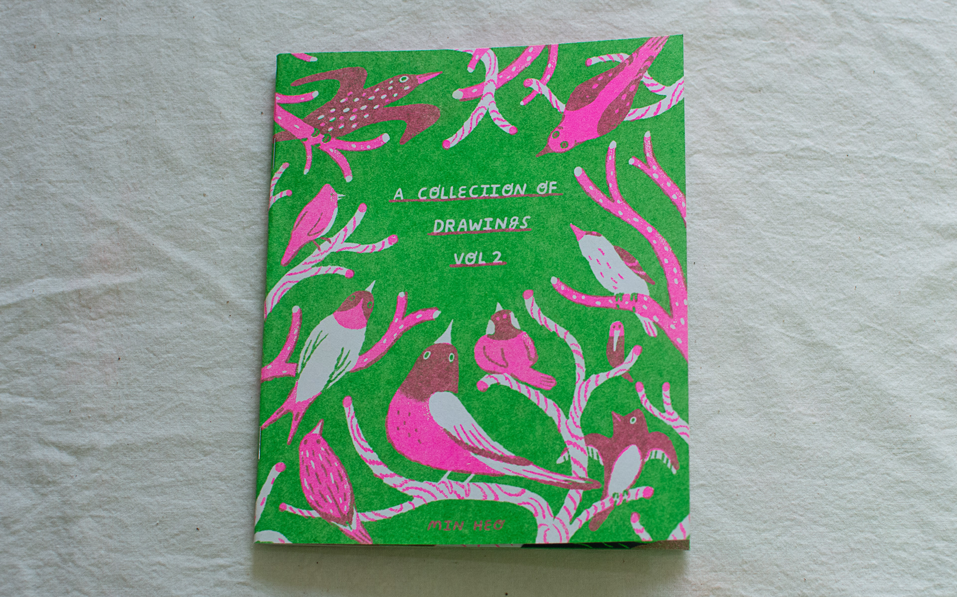 A Collection of Drawings 2 is a 48 page Risograph printed book, printed in Kelly Green, Flo Pink, and Midnight. Staple bound. 6x7.25", 2023.