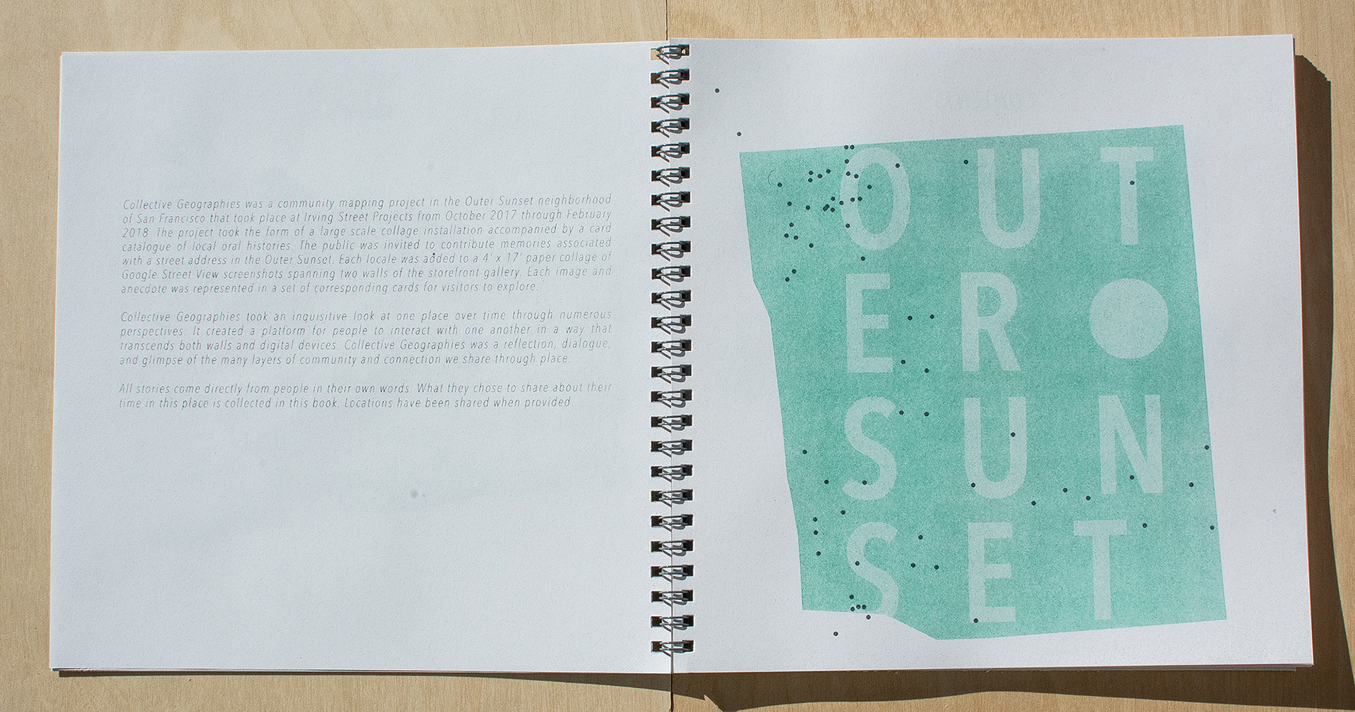 Collective Geographies was a community mapping project in the Outer Sunset neighborhood of San Francisco that took place from October 2017 through February 2018. The project took the form of a large-scale collage installation and accompanied by a card catalogue of local oral histories. The Collective Geographies installation was located at Irving Street Projects in the Outer Sunset. The public was invited to contribute memories associated with a street address in the Outer Sunset. Each locale was added to a 4'x17' paper collage comprised of gathered Google Street View screenshots spanning two walls of the storefront gallery. Each image and anecdote was represented in set of corresponding cards for visitors to explore.