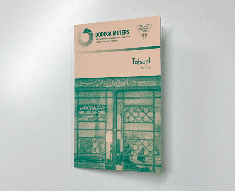 Tafseel is 36 pages, risograph printed in Turquoise on French Orange Memo Kraft & Husky paper. 5x8". Edition of 200 +25.