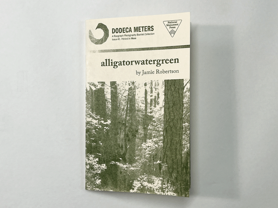 alligatorwatergreen is an investigation and celebration of swamps. The text of alligatorwatergreen was crowdsourced from a survey measuring attitudes about the word “swamp”. What words come to mind when you hear the word 'swamp'? The booklet features responses from 85 respondents on their ruminations on this question. The subsequent responses are paired with images from swamps in Virginia and Texas, between 2007 and 2024; over 17 years. alligatorwatergreen combines text and image to explore the reality of swamps and how they live in the public imagination.