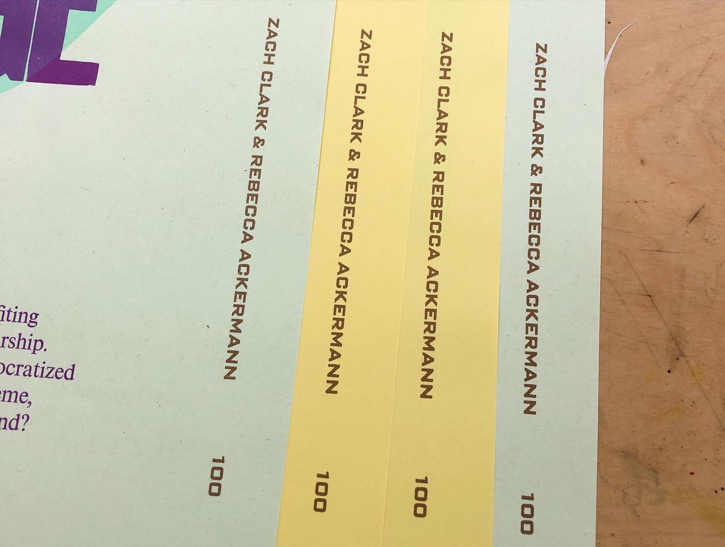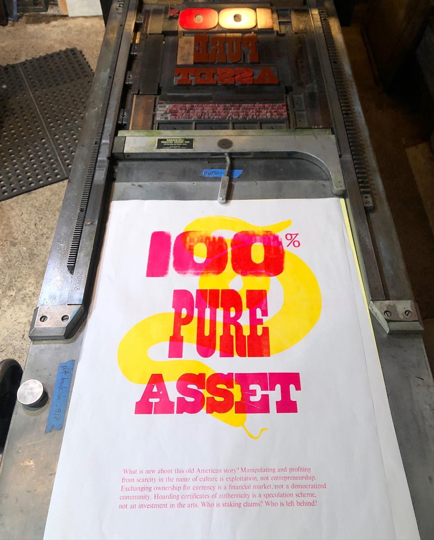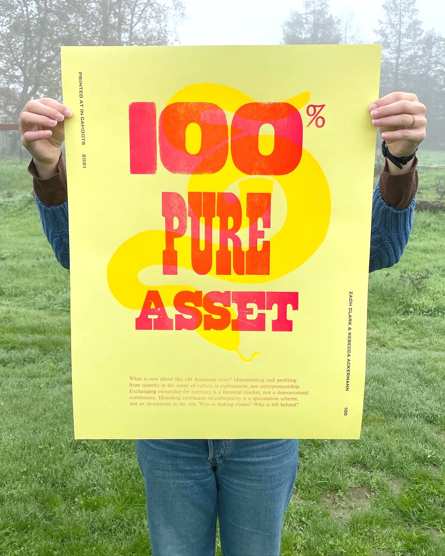 Created in collaboration with Rebecca Ackermann, Four Letterpress Posters Concerning Contemporary Trends In Art is a series of lino, wood, and lead type prints made as response to current trends regarding the marketplace around NFTs. All four posters we printed in three layers on a Vandercook Universal 3 at In Cahoots Residency in Petaluma, CA in December 2021. 18x24", French 70lb text paper, oil & rubber based inks, edition of 100 each.