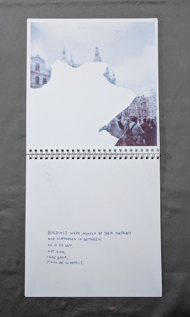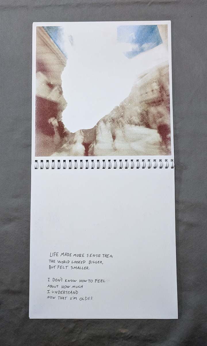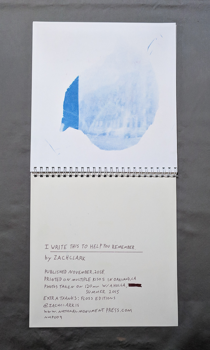 I'm Writing This... is a collection of Holga photographs taken in 2015 and text combining notes from the times they were taken with contemporary writings in reflection. While in storage, the prints quickly decomposed, the emulsion peeling away, leaving disconnected images that resemble only a part of the image they once captured.