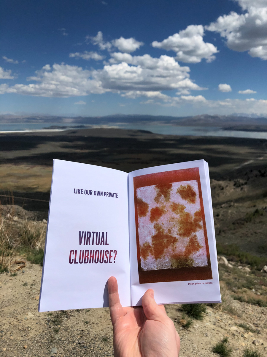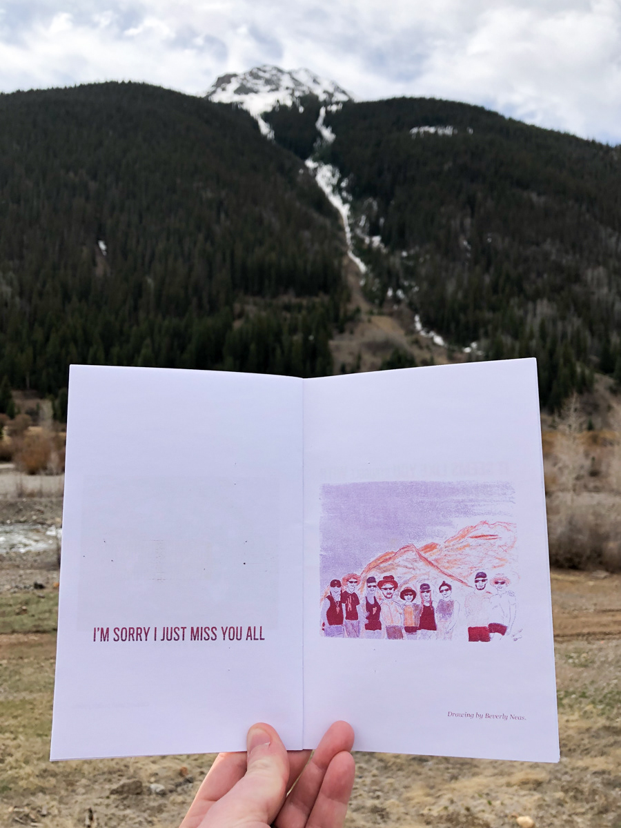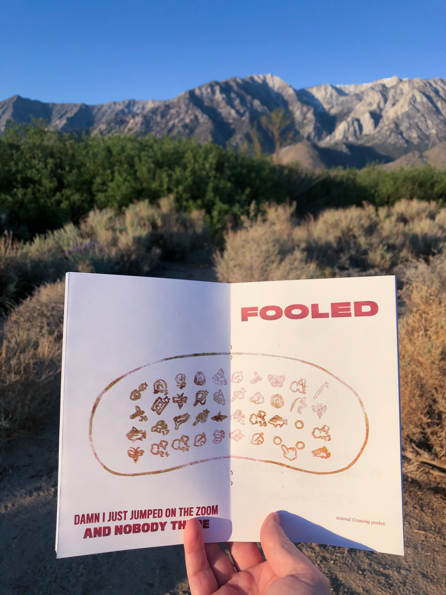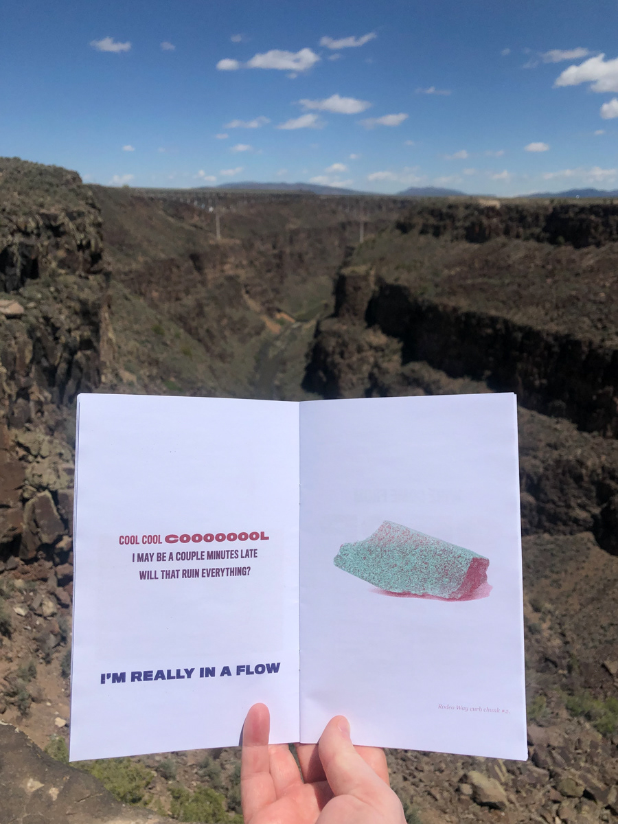 "This book was made between the months of April and October of 2020. Prior to the Pandemic, I had plans to make work involving ideas about souvenirs informed by travels I had planned throughout the year. Those travel plans obviously didn't happen, so I started collecting objects and images from time spent at home, which was all the time. Another kind of souvenir I began collecting were out of context test messages from my close friend group chat, called the Lemuria Seekers. This group chat served as one of the only sources of joy and connection during that time. " - Faith Sponsler