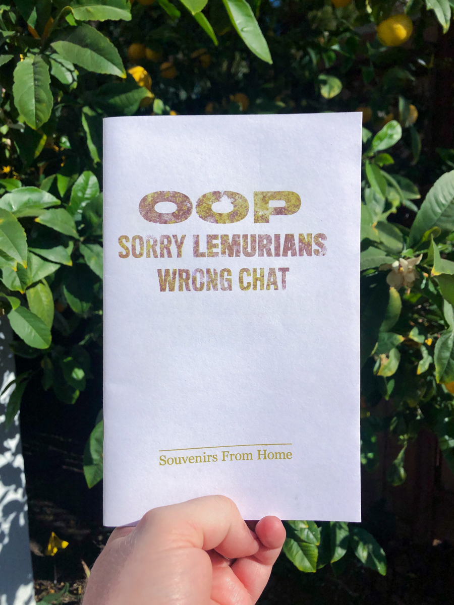 You can purchase Oop Sorry Lemurians Wrong Chat here, and her first book Liminal Material here.