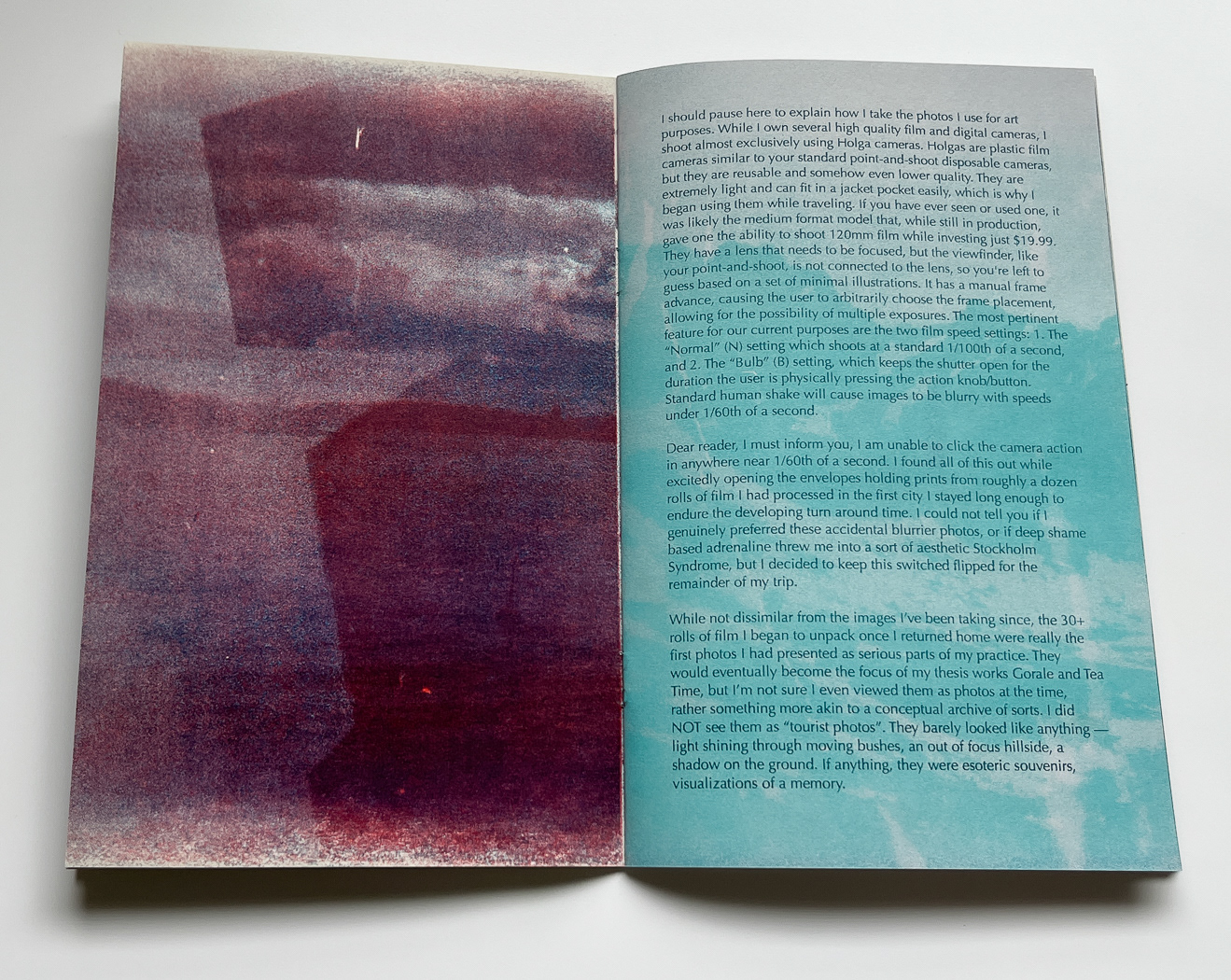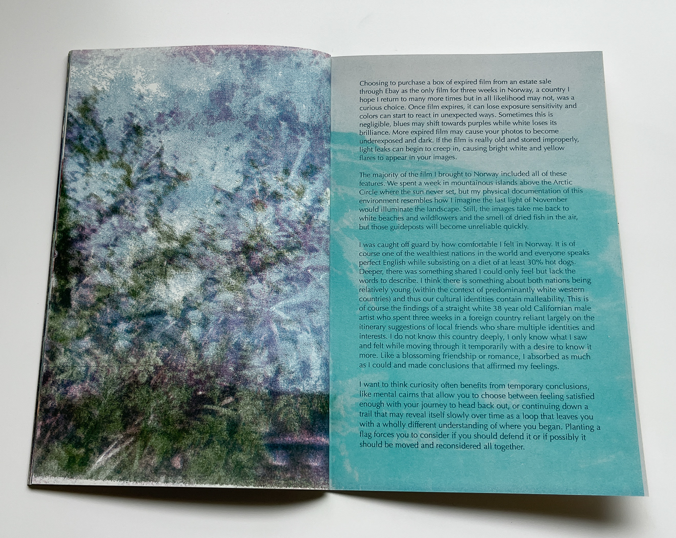 In May of 2022, I returned to Scandinavia, a region that has been pivotal to my creative work over the previous years. For 3 weeks in Norway and Denmark, including a week on the Arctic islands of Lofoten, I brought a case of highly expired film, more expired that I had anticipated. What resulted was a collection of mysterious and ominous images that did not remotely reflect the midnight sun of the region. Tourist Photographs is a book compiling images from these rolls of film combined with an essay navigating my relationship to photography, especially as a traveler.