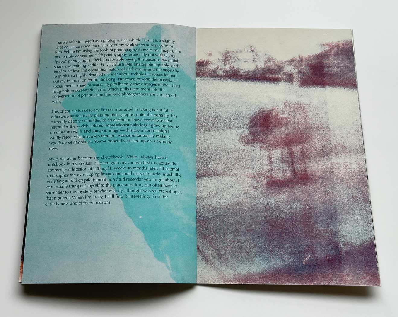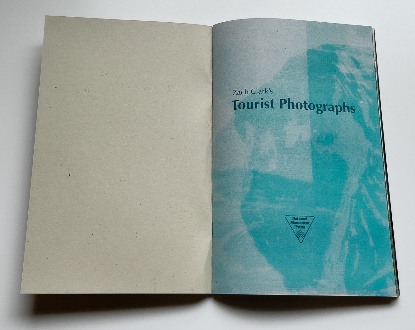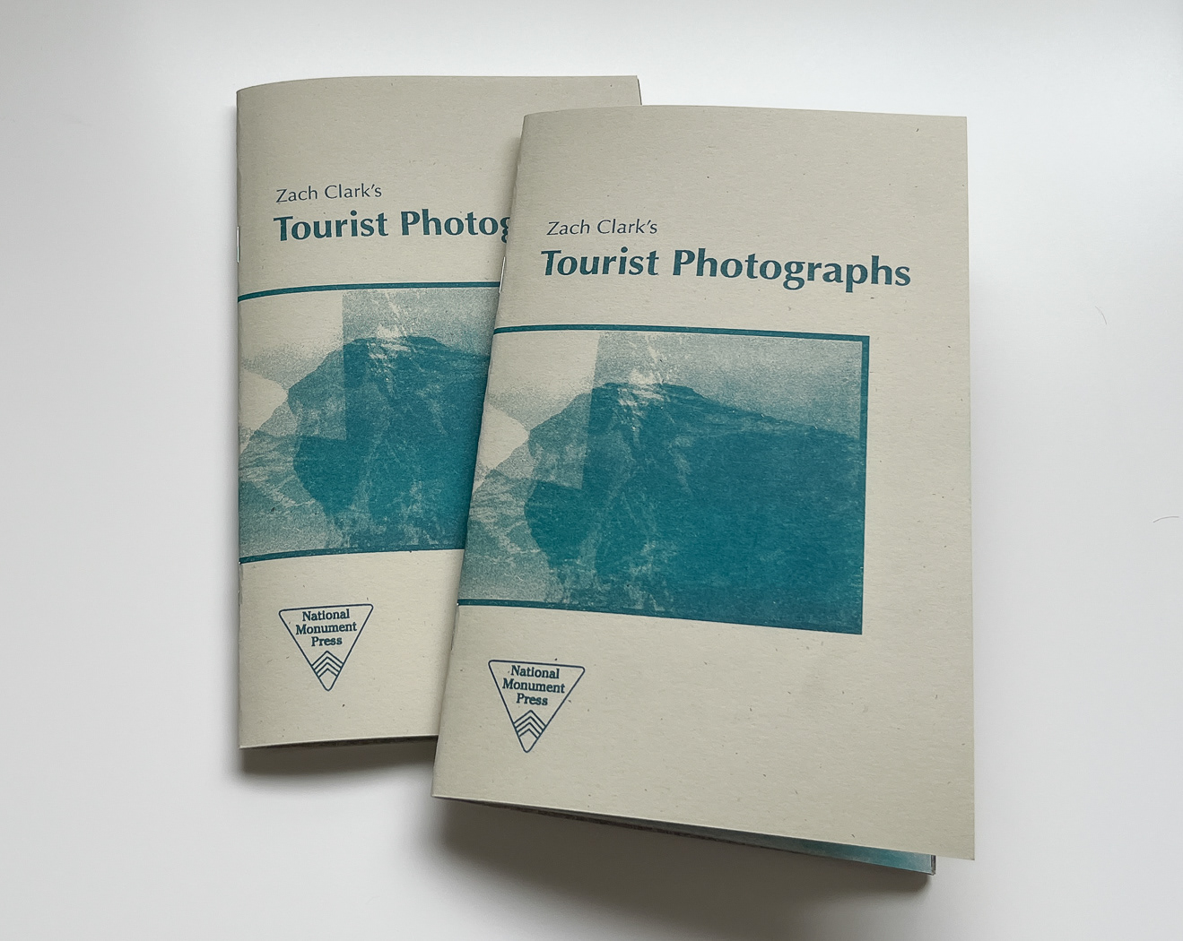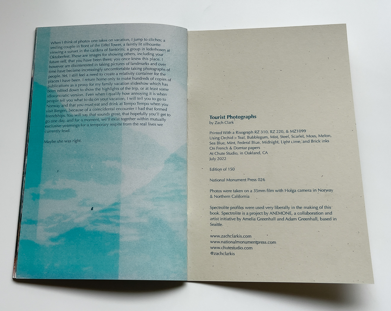 Tourist Photographs is printed on a Risograph RZ310 and MZ 1090 in 12 colors, 32 pages, in an edition of 150, 5x8", July 2022.