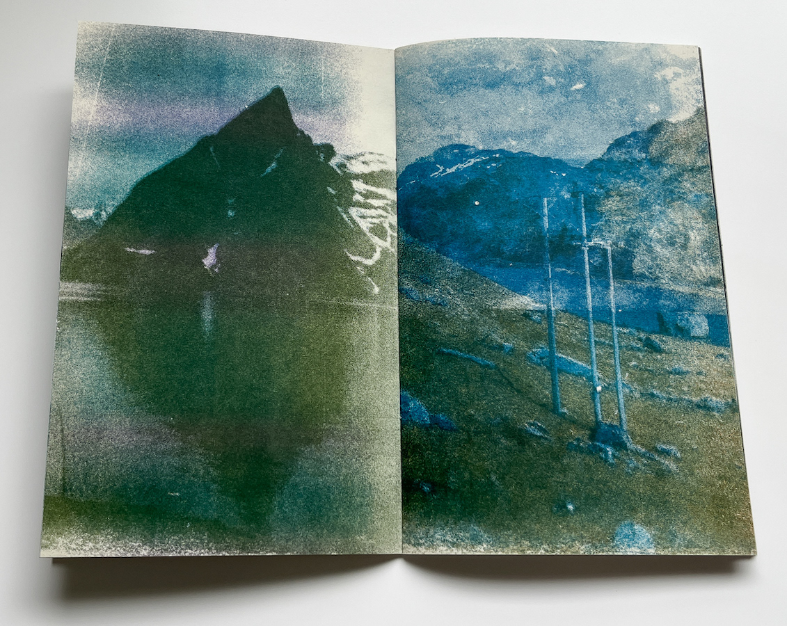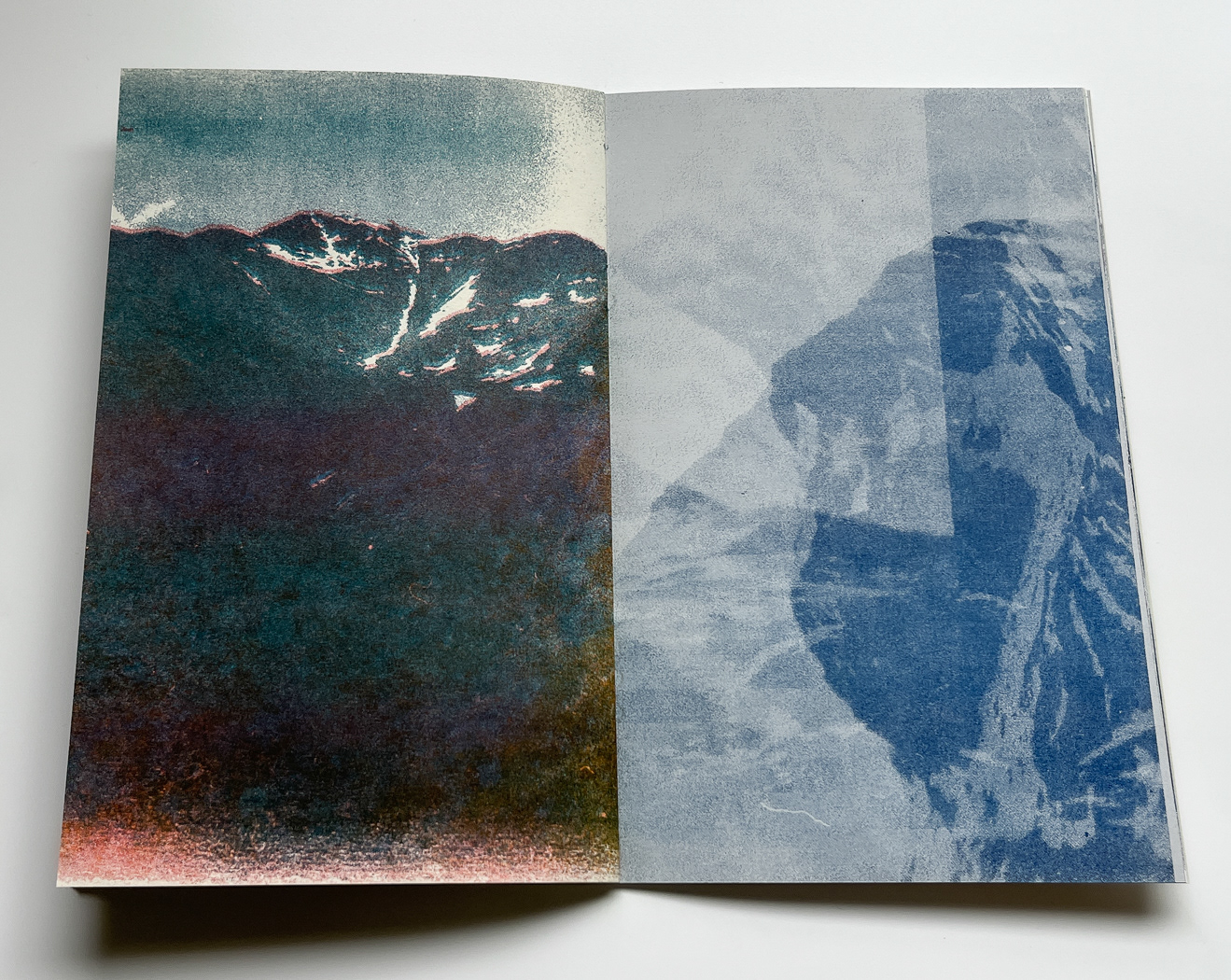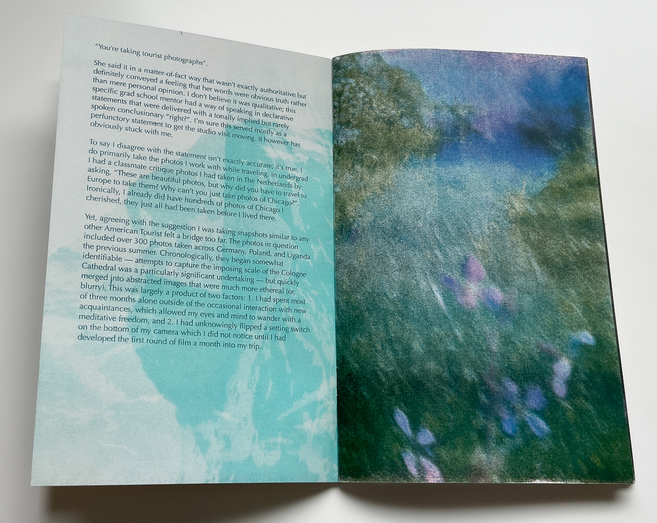 Tourist Photographs is printed on a Risograph RZ310 and MZ 1090 in 12 colors, 32 pages, in an edition of 150, 5x8", July 2022.